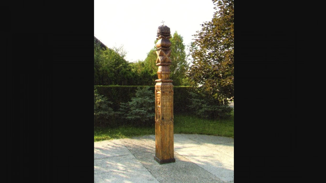 Kopjafa, tetején a magyar koronával.